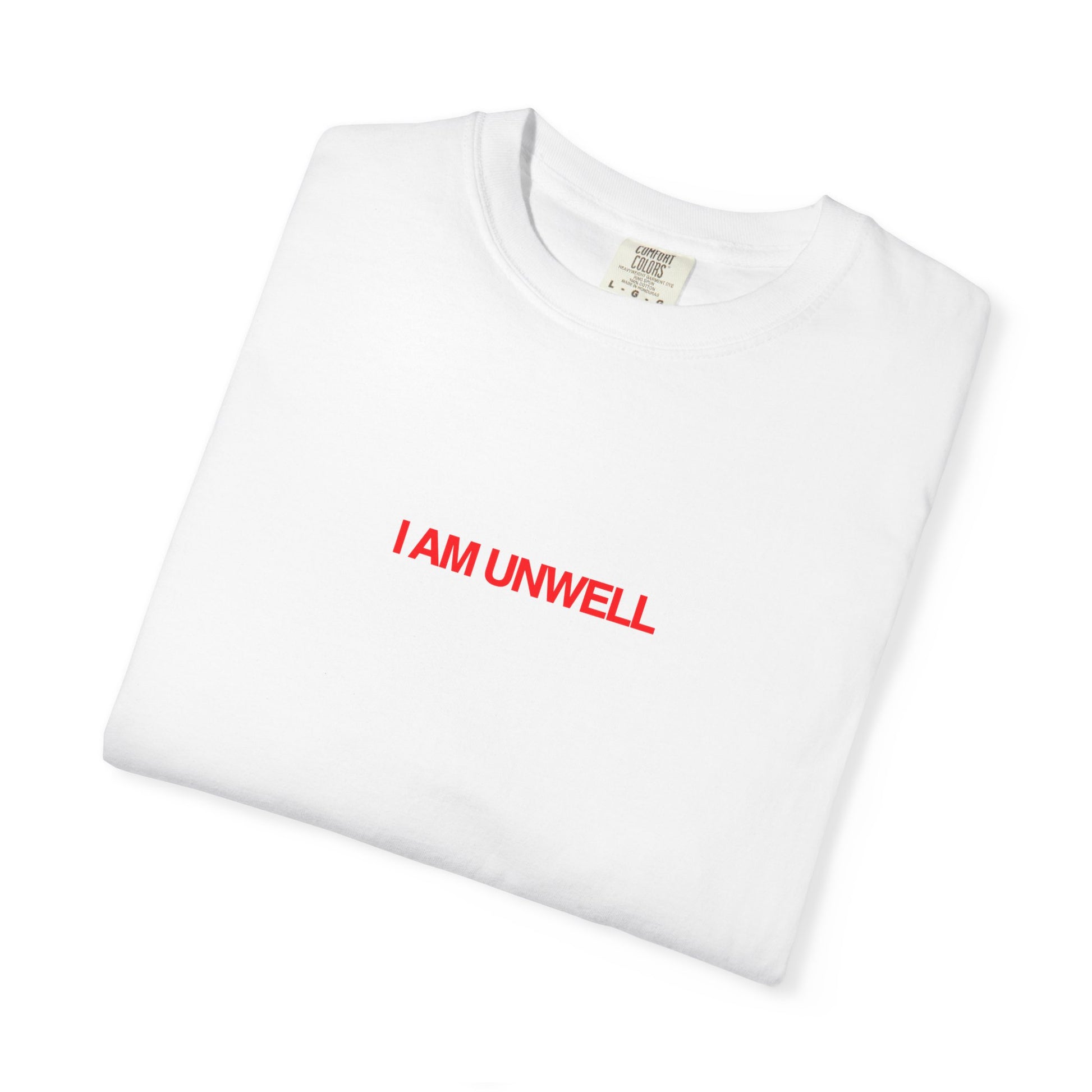 A heavyweight, garment-dyed tee that wears like a lived-in favorite from day one. Clean, bold red lettering — a small “I AM UNWELL” on the chest and a larger “UNWELL” with tiny “TRAINING CLUB” beneath on the back — gives this shirt an honest, quietly rebellious voice. The relaxed fit and soft, post-dye finish make it comfortable for long days of running errands, low-key hangouts, or slow mornings at home. It reads like a private statement for those who prefer dry humor and understated design, pairing easily with worn-in jeans, layered hoodies, or a simple beanie when you want to be seen but not shout. The sewn-in label and tubular knit keep the silhouette clean and durable, so the piece stays familiar and true through many wears.
